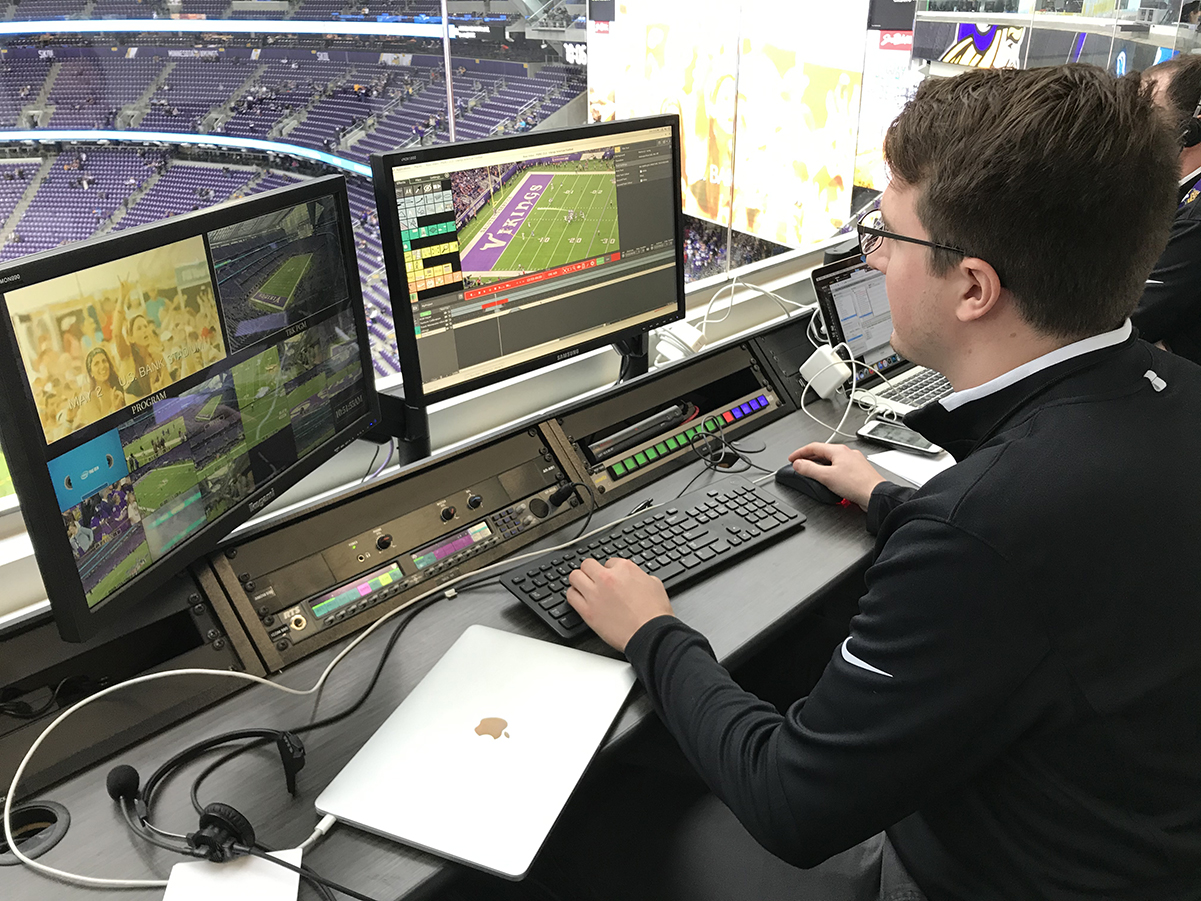 For home games, including the important upcoming game against the Green Bay Packers on Monday, Dec. 23, Clark works in the U.S. Bank Stadium broadcast room collecting footage and creating videos or adding graphics to footage for in-stadium fans.