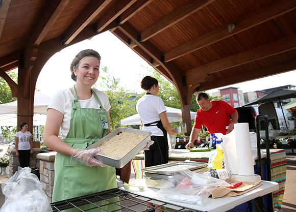 UW-Stout dietetics student Amanda Nass offers zucchini dessert squares at the Veggin’ Out booth at the Downtown Farmers’ Market in Eau Claire.