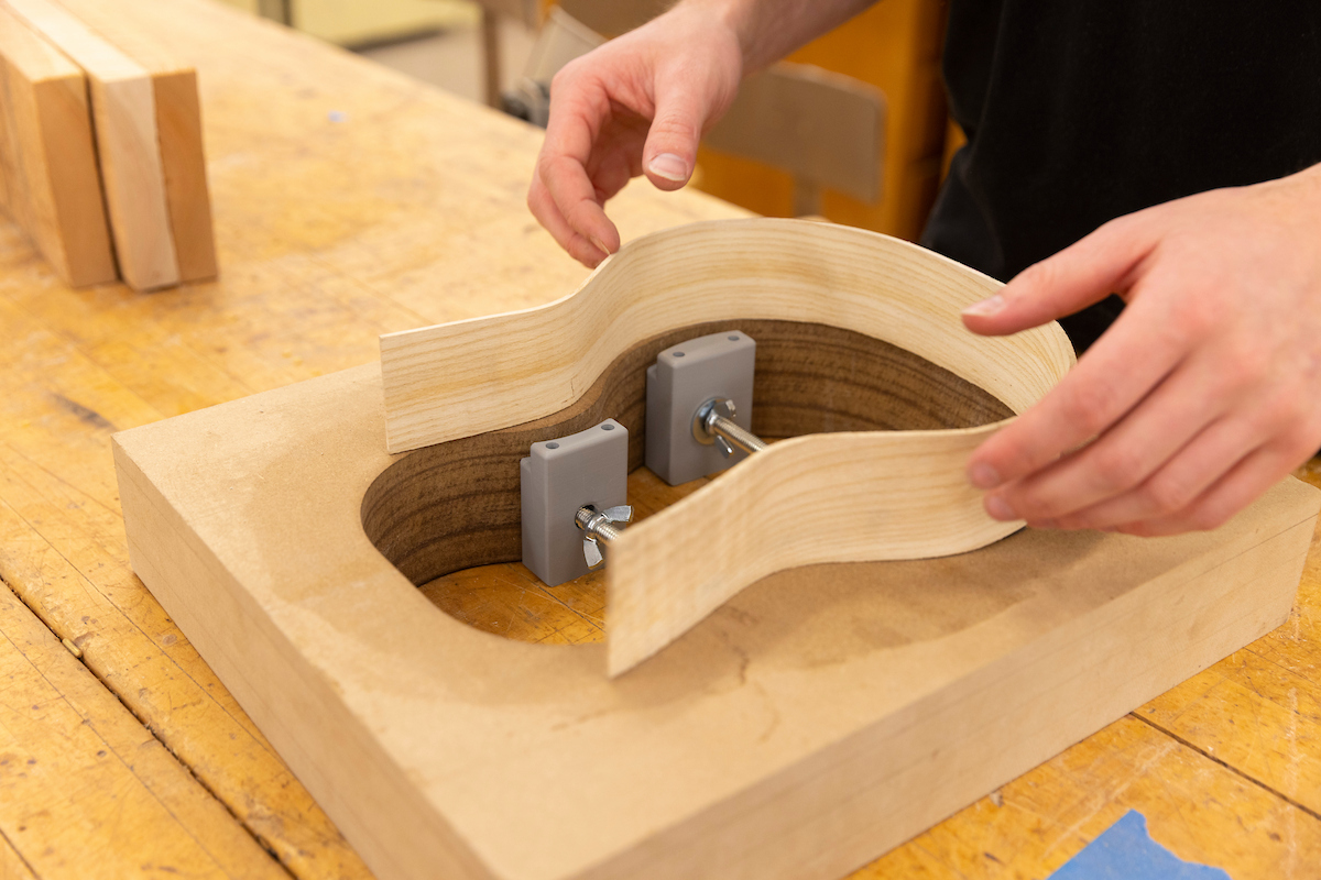 “We then steamed .08-inch-thick strips of ash wood for 45 minutes to make it malleable and clamped it to the inside of the main jig block for 48 hours to create the exterior curve of the instrument,” Kraft said. “The quality of the wood can affect how it curves, as well as how long it is steamed. We found that 45 minutes in the steamer was optimal for malleability, and that knots will affect the wood’s strength. It will weaken and split at the knot when curved.”