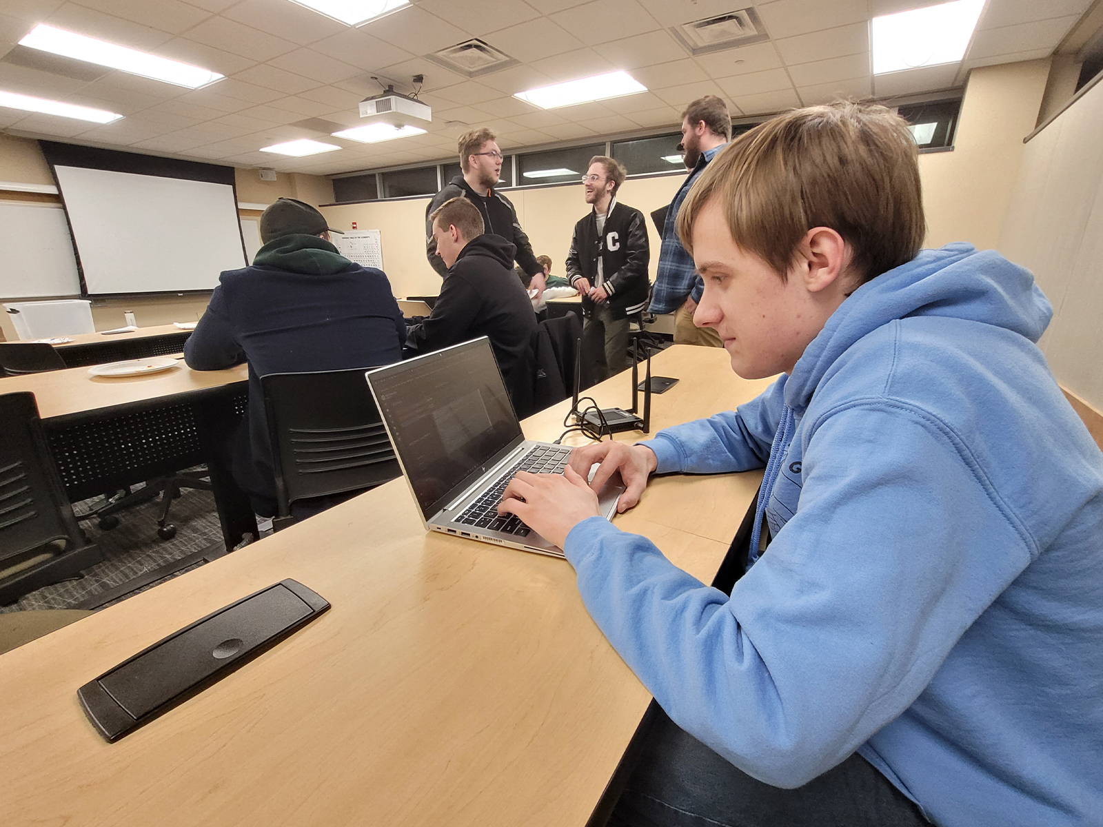 As CCDC practice winds down, several students head to the Information Security Professionals meeting. It’s a long walk through the longest building on campus. From Micheels Hall, you pass by windows that look into Stout’s construction and plastics engineering labs in Jarvis Hall Technology Wing, before entering the Science Wing.