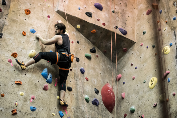 Top: A UW-Stout student goes up the Stout Adventures climbing wall.