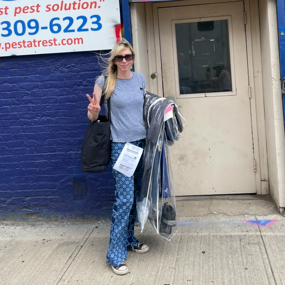 Emily is currently working on “Law & Order”, managing behind-the-scenes costume work and on-set responsibilities. Her days can include prepping uniforms for background actors, distressing garments to look camera-ready, dyeing fabrics, managing racks of clothing and following actors through long shoots to ensure every detail matches continuity. It is demanding work that requires technical knowledge, calm under pressure and the ability to solve problems quickly, often overnight. Even while working long hours on set, Emily continues to design in her own time. During breaks between productions, she returns to pattern drafting and garment construction for personal design projects, keeping her creative practice active beyond television. This ongoing work reflects the same hands-on mindset that launched her career and allows her to explore fashion on her own terms.