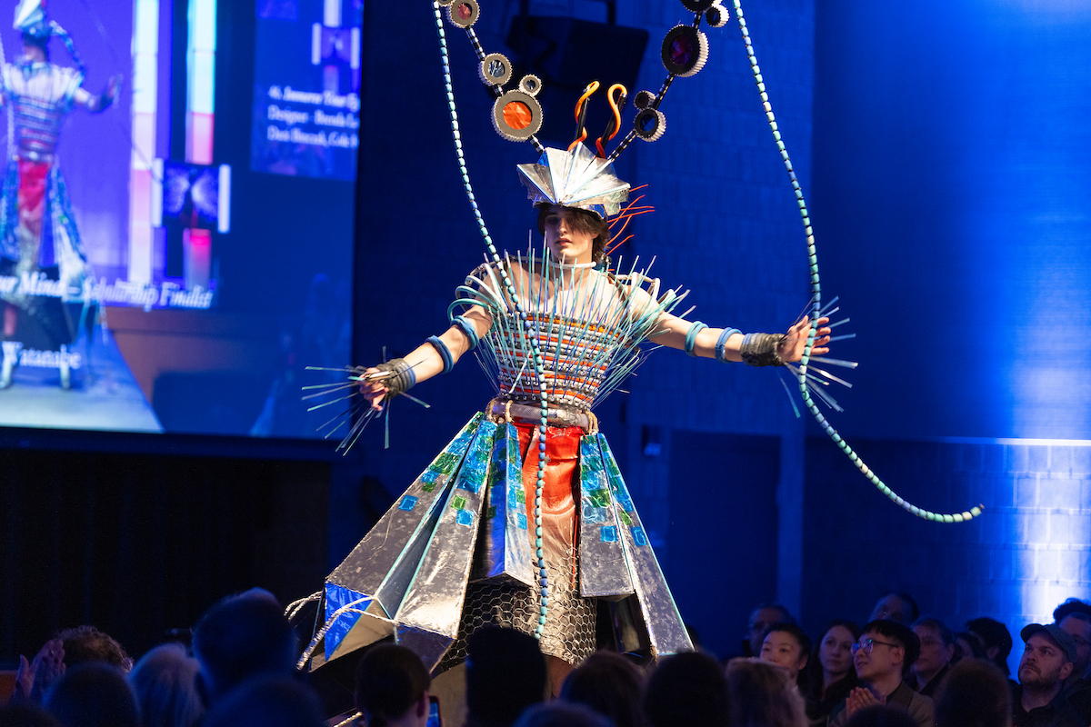 This year’s theme, “Years in the Making,” reflected the university’s Year of Design and celebrated the “hellish mesh of hot glue and cardboard” transformed into works of wonder, like a caterpillar emerging as the butterfly, said the evening’s emcee Ainsley Violet, a studio art senior and Student Artist-in-Residence.
